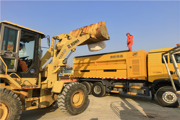 庫房外,裝載作業秩序井然。鏟車司機嚴格按照安全操作規程作業,實行“一人精準操作,一人旁站指揮,一人專職掛鉤”的三人協同工作模式。在清晰的口令與手勢配合下,鏟車平穩地將融雪劑吊起,安全、準確地裝入待命的灑布車罐體內。整個過程銜接流暢,配合默契,充分展現了工區規范化的作業水平和嚴謹的安全意識。