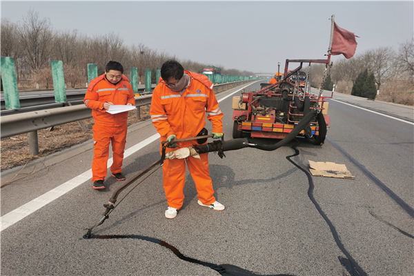 一是對全線路面進行灌縫作業。在作業期間,施工人員嚴格按照施工規范進行施工,安全員認真負責的對全過程進行監督。灌縫作業使用了青蘭養護工區自行改裝的自走式灌縫機,利用灌縫機自身動力行進,省去了牽引車輛和部分人力,提高了工作效率。