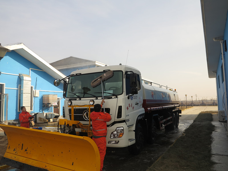 為避免除雪車上的積雪融化與車身附著的鹽水對車輛造成腐蝕,及時對除雪作業車輛的每一個角落進行清。首先對車輛外觀進行沖洗,將除雪過程中附著在機械設備上的污垢、融雪劑等沖洗干凈;隨后將輪轂、輪胎等死角進行清理;最后對除雪機械進行仔細檢查,對有損壞的部分及時修理、更換。由于天氣溫比較低,車庫內的水管都被凍住,工程隊從餐廳內從新接上水管,然后把水槍移到餐廳后面的一處空地進行清洗工作,在沖洗過程中車廂底部早已結了一層厚厚的冰,水槍很難沖洗下來,隊員們不懼寒冷,用手和鐵锨先將其清理干凈后再用水槍清洗。