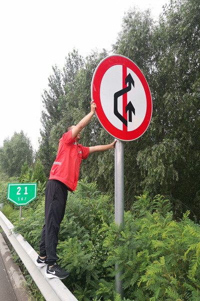 公路標志出現歪斜倒伏等情況將直接影響駕駛員對公路標志牌的辨別,失去指示與警示的功能,必須迅速恢復原狀,養護股成員二話不說,立即下車,頂高溫、戰酷暑,從巡查車上取下工具,對該標志牌進行了校正、加固,在最短的時間內維修好歪斜變形的標志牌,第一時間保障了衡德高速公路安全暢通。