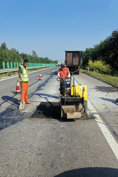 青蘭養護工區工程隊隊長鄭文周提前對轄區內路面坑槽位置、大小等情況進行記錄,認真制定坑槽修補方案,并迅速組織隊內成員對坑槽進行修補工作。在作業現場,?嚴格按照《公路養護安全作業規程》要求,設置警示標牌,布好安全區,做好各項安全防范措施,確保施工作業安全。按照“圓洞方補,斜洞正補”的原則,劃線、切割、開槽、清理廢渣、刷粘層油、攤鋪、整型、碾壓,確保修補后坑槽與周圍路面銜接良好、平直,盡做大努力為廣大司乘提供一個安全的通行環境。
