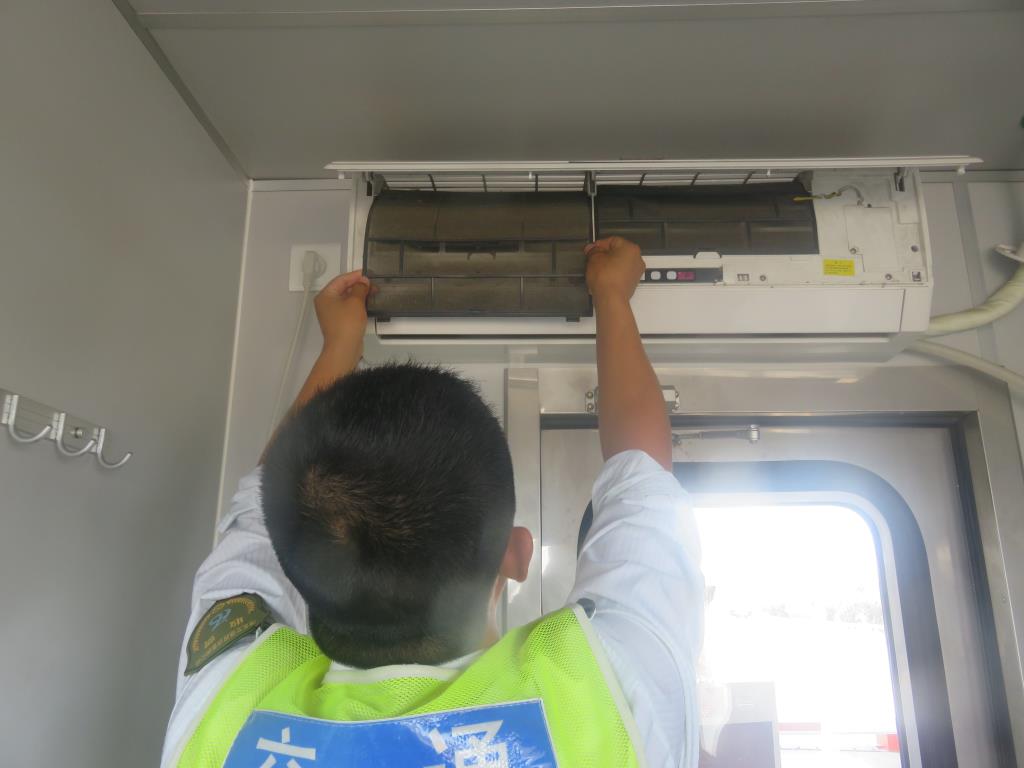 班長與收費(fèi)人員一起對崗?fù)?nèi)空調(diào)設(shè)備逐一進(jìn)行檢查,在檢查過程中發(fā)現(xiàn)空調(diào)機(jī)雖然都能正常運(yùn)轉(zhuǎn),但是機(jī)內(nèi)雜塵和飛蟲特別多,如此多的雜塵不僅危害收費(fèi)人員的健康,也容易耗損機(jī)器壽命。于是班長帶領(lǐng)班組人員依次摘除空調(diào)過濾網(wǎng),同時(shí)再次檢查機(jī)器是否完好,是否存在安全隱患。清洗完后,還貼心的將過濾網(wǎng)擦干再進(jìn)行安裝。