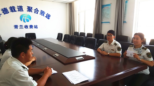 6月18日下午四時許,青蘭收費站收費C班開展了便民培訓活動,模擬為司乘人員指路。活動由班長謝金樹主持開展,針對青蘭站開通以來司乘經常問到的地標、路段,隨機抽取其中幾個,對收費人員進行提問,測試收費人員是否能簡潔明了的回答。最后,班長對收費人員回答不精確、不清楚的地理位置進行了查詢更正。