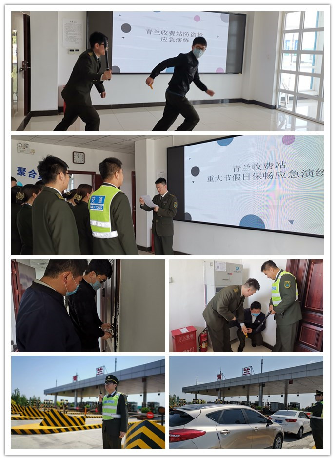 4月26日上午,青蘭收費站組織開展重大節假日保暢和防盜搶應急預案演練全站職工30余人參加。