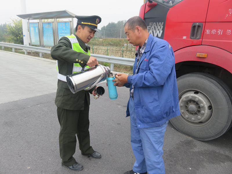 10月23日,天空被薄霧籠罩,天氣陰冷。由于封道,許多車輛滯留在青蘭收費站外廣場上,有的甚至已經(jīng)超過24小時。想著此時的天氣狀況,收費站D班班長尚澤決定主動為滯留司機們送去熱水,一來是驅(qū)走寒冷,二來是緩解司機們長時間等待的焦躁情緒。這個舉動獲得司機們的一致好評。