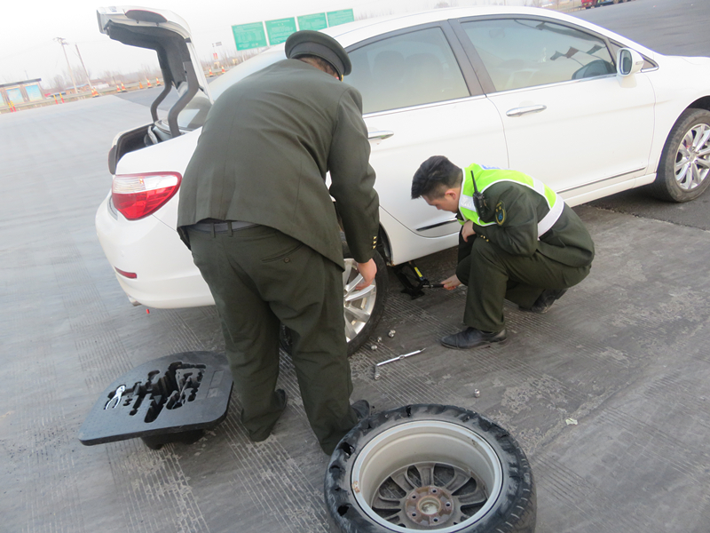 原來司機來衡水出差回東營,在半路車胎壞了只能就近出高速,司機是一名女士,不懂怎樣更換輪胎,著急的向疏導員尋求幫助,本著“至親至誠,樂善樂為”的服務理念,班長謝金樹同疏導員孫彥晶兩人分工合作,一人支起千斤頂,一人將舊輪胎卸下,幫助司機換好了輪胎。