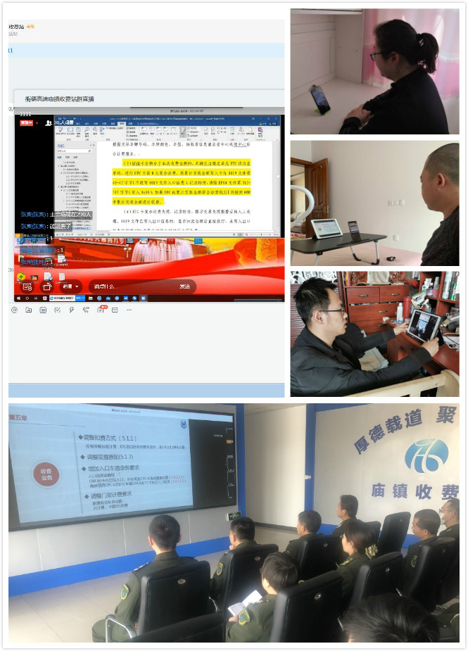 為保證本次培訓會效果,廟鎮收費站領導班子,結合站內實際情況,集思廣益,創新培訓方法。一方面將培訓內容映射到大廳LED屏上供在站職工學習;另一方面利用釘釘軟件電腦版進行直播,讓因網絡擁擠進入不了在線培訓會的在家職工也能參與進來。通過線下線上相結合的方式,確保培訓會全員覆蓋、全員參與。