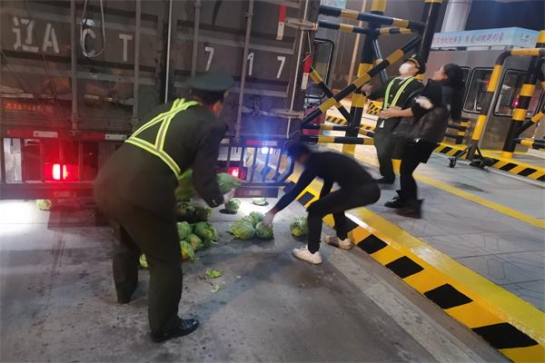 10月30日凌晨一點,青蘭收費站收費C班班長平國慶和疏導員多林在對一輛遼寧拍照的綠通車進行查驗時意外發生了:車主打開后車門的一瞬間,散裝的甘藍如同泄閘的洪水一樣滾了下來,散落在收費車道。車主瞬間慌了神,多林趕緊用身體頂住車門,防止更多的甘藍掉落。