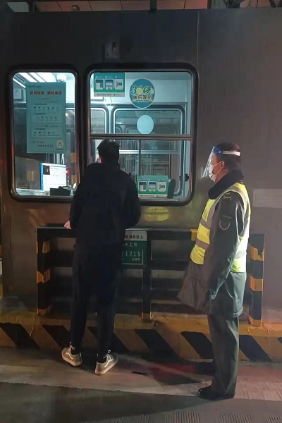 黑色轎車又向前繼續行駛了幾十米后剎車燈亮起,隨后折返回來。班長魏向謙和疏導員耿曉鐸穿戴好防護用具上前了解情況。