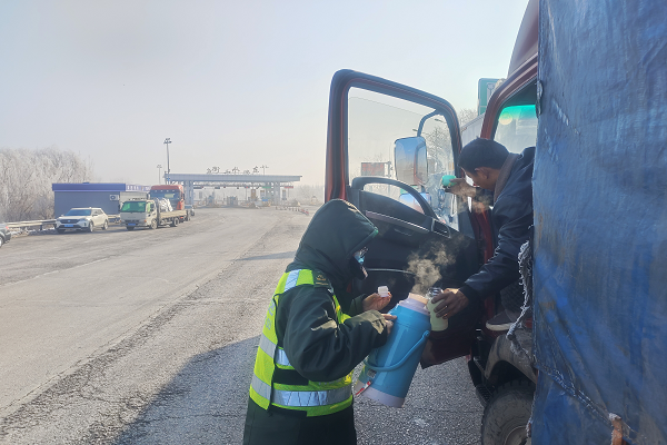 面對滯留司機的焦躁與不安,當班人員一邊為司機提供實時路況信息,耐心做好解釋工作,并為著急趕路的司機提供道路指引;另一邊給司機提供熱水的暖心服務,為焦急等待的司機送去一份溫暖。這些暖心的行為受到了司機的一致好評。