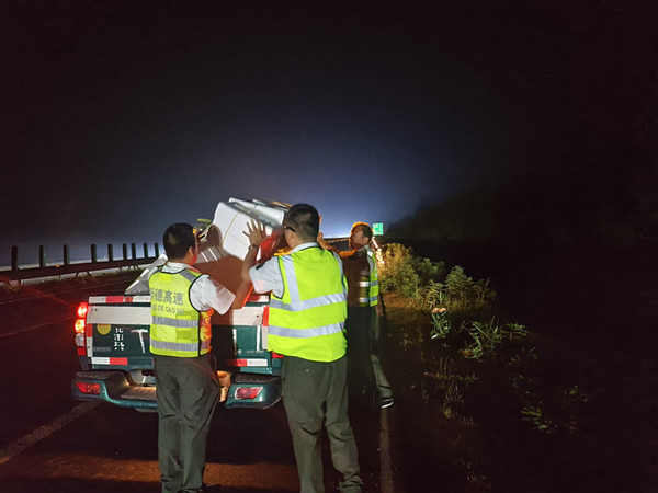 20點29分,值班站長龐向陽帶隊到達障礙物點附近,發現路邊、車道及隔離帶里散落的全是泡沫箱和破損的泡沫箱碎片。為確保作業安全,避免散落物繼續對過往車輛的通行造成影響,現場人員第一時間擺放反光錐筒,開始清理撿拾工作。經過近半個小時的緊急處置,路面及隔離帶內的散落物清理至安全地帶確保了道路的安全暢通,及時消除了安全隱患。