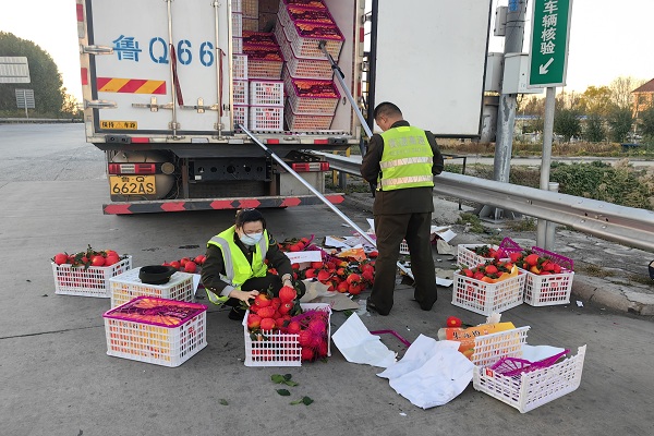 11月4日16時50分許,衡水東收費站收費外廣場一輛綠通車準備接受查驗,因減免金額較大,值班站長和疏導(dǎo)員正準備“兩人驗貨 多點查驗”。司機剛打開后車門,突然兩筐水果散落出來,重重地砸在地上。還沒等司機反應(yīng)過來,隨著后車門縫隙變大,接連六七筐水果也掉了下來。司機見狀待在原地,不知所措。