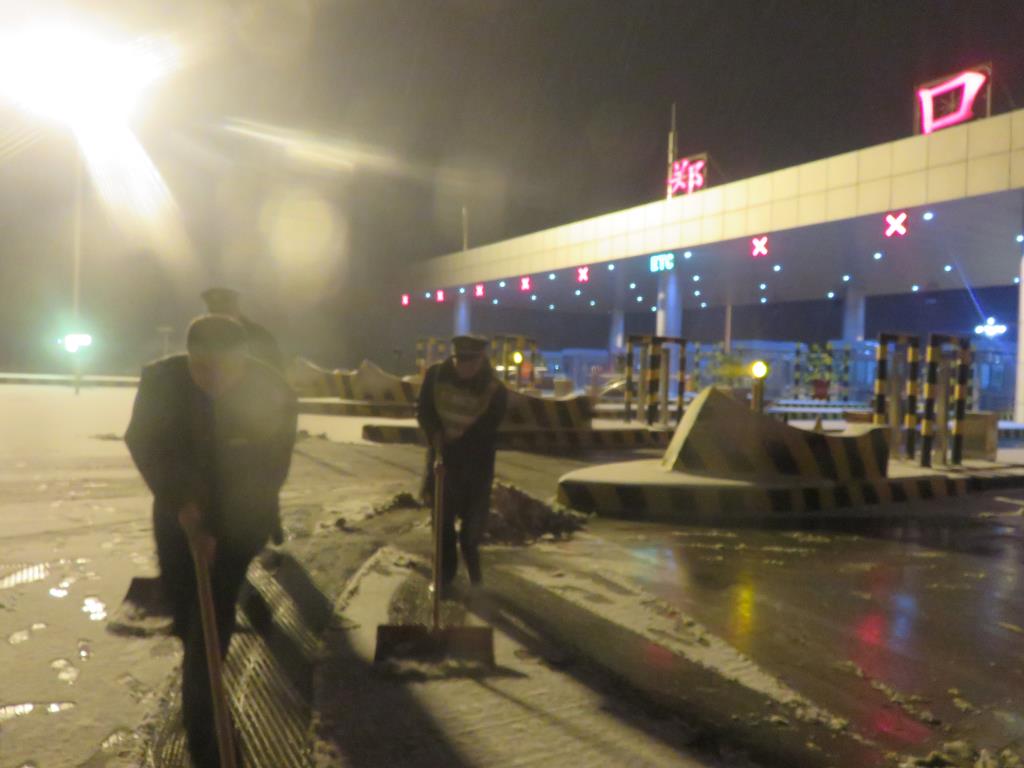 在站長的帶領(lǐng)下,大家拿著鐵鍬、掃帚等工具來到了收費(fèi)廣場,不顧刺骨的寒風(fēng)、不顧一天的疲憊,全力清除著車道、廣場內(nèi)的積雪,大家團(tuán)結(jié)協(xié)作、全力奮戰(zhàn),經(jīng)過三個(gè)多小時(shí)的努力,終于將收費(fèi)廣場及車道、島頭的積雪清理干凈。
