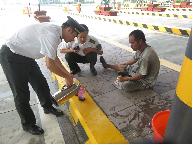 8月5日15:40分左右,青蘭收費站C班班長謝金樹正在崗?fù)ね鈭?zhí)勤,天剛下過雨,一個步履疲憊的人影朝著收費站走來,謝金樹立即上前詢問,那人說著一口聽不懂的方言,繼續(xù)向高速上走去,謝班長和疏導(dǎo)急忙將其攔下,并詢問原因。