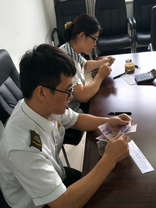每班組、科室各推選1人參賽,根據抽簽確定出場順序,每場2名參賽選手參加。參賽選手對不同面額的鈔票張數和金額進行準確清點,并要求將混入的點鈔券正確識別并算出金額,最后按規定要求填寫點鈔記錄表。比賽采用準確度與速度雙項得分的方法,綜合選手點鈔速度、準確率、點鈔券識別等多種因素評出優勝者。比賽一開始,競爭氣氛就非常熱烈。參賽選手聚精會神,爭分奪秒,緊張而迅速地清點著手里的鈔票,場外人員聚精會神,生怕錯過精彩瞬間。經過激烈的比賽,票據室姚立童獲得第一名。