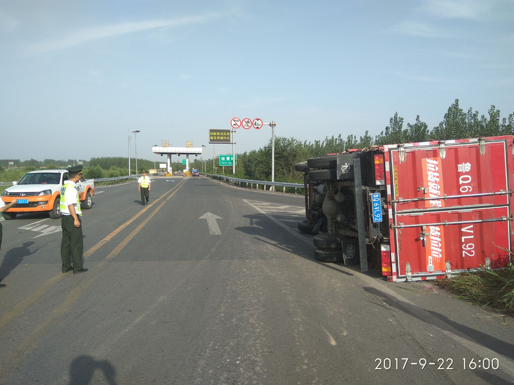 2017922日下午1548分,一輛懸掛藍色牌照的小型箱貨車在行駛至281省道與衡德公司廟鎮(zhèn)收費站拐彎處時,由于車速過快,導致車身發(fā)生了嚴重傾斜,致使整輛貨車翻倒在了路口處的隔離帶內(nèi)。車禍發(fā)生后,廟鎮(zhèn)收費站的張文恒同志在第一時間內(nèi)發(fā)現(xiàn)并通知了站區(qū)領導,隨后在廟鎮(zhèn)收費站值班站長房磊同志的帶領下,我與班長范海峰同志迅速進行了交通疏導,防止二次事故的發(fā)生,同時協(xié)助現(xiàn)場司機積極進行自救。由于處置及時現(xiàn)場并未發(fā)生更嚴重的后果,駕駛員也及時逃生,事故現(xiàn)場得到了很好的保護。