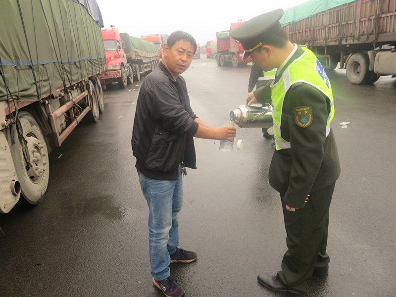 國慶假期的最后兩日,接交警通知青蘭站實行交通管制禁止黃牌車輛上道,廣場上的滯留車輛漸漸多了起來,當(dāng)班班長帶領(lǐng)疏導(dǎo)人員不斷詢問司機的目地的,為他們指引其他路線,但很多去南方的車輛因德州外環(huán)禁止貨車通行的緣故只能等待高速開通,導(dǎo)致了外廣場上堆積了大量的貨車。加上天公不作美,下起了冰冷的秋雨,天氣變得非常寒冷。本著“至親至誠,樂善樂為”的服務(wù)理念,青蘭站的職工為司機送去了熱水,幫助司機泡面。因車輛較多,兩名職工連續(xù)往返十多次不斷地供應(yīng)著熱水,爭取能照顧到所有的司乘,只為在這寒冷的天氣里為司機送上溫暖和祝福。