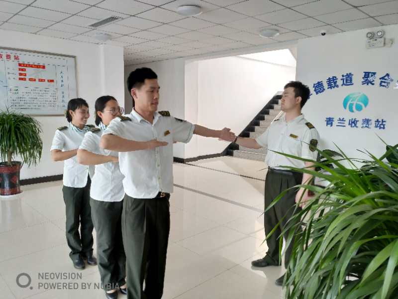 因近期崗前培訓期間發現員工在做文明服務時動作不到位、不標準。6月19日,青蘭站收費A班在班長謝金樹的指導下,進行了文明服務強化訓練。這次強化訓練中班長根據分解動作,一步步糾正不規范動作,讓班組成員的動作記憶更加深刻,使動作更加標準。此次訓練使班組成員的服務動作更加整齊、規范有序,有益于提高班組文明服務水平。
