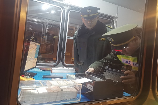 為確保換票工作按時進行,不出現紕漏,31日21時,值班站長秘春雨對當班收費班組、票證室及辦公室進行了全面部署,明確了人員職責,細化分工。票據員王桂云負責將新票按車道號寫好標號,提前放置到相應車道;當班班長謝金樹負責查看車道及收費內廣場車流情況,避免因換票工作導致車輛擁堵;辦公室人員做好影像留存工作。23時15分,各項工作按部就班,各崗人員準備就緒,在值班站長秘春雨帶領下,票據員王桂云、收費班長謝金樹及辦公室人員李名九按照計劃對四個收費車道內的舊票進行更換,依次將舊版地稅微機票取出,更換為新版國稅機打票,并安裝進打印機中,票證員王桂云對全部舊微機票進行清點、登記、封箱。零點交接班后,隨著107車道首張票的成功打印,標志著青蘭收費站年度新票更換工作順利完成。
