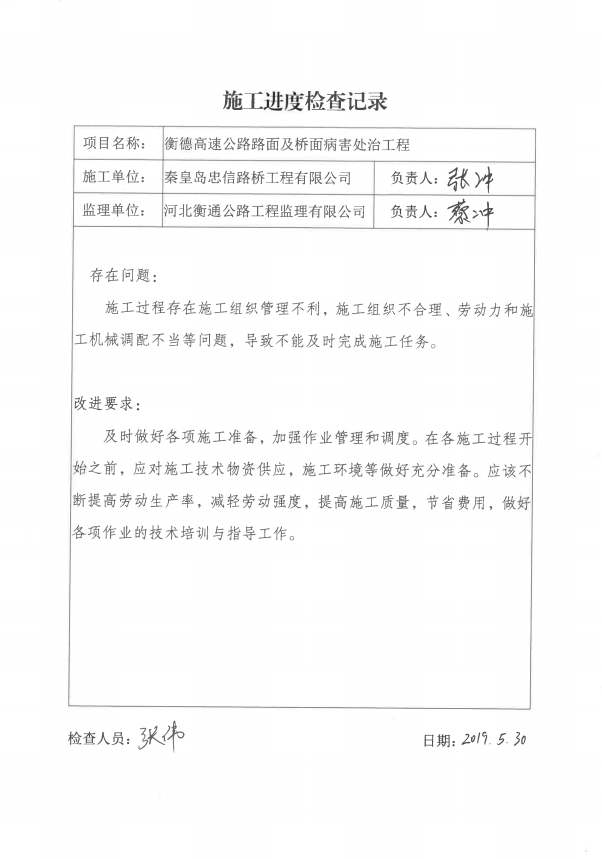衡德高速公路有限公司工程養護安全部對衡德高速公路路面及橋面病害處治工程施工進度進行檢查,發現施工過程中存在施工組織管理不利,施工組織不合理、勞動力和施工機械調配不當等問題,導致不能及時完成施工任務。針對問題對施工單位提出相應改進要求。