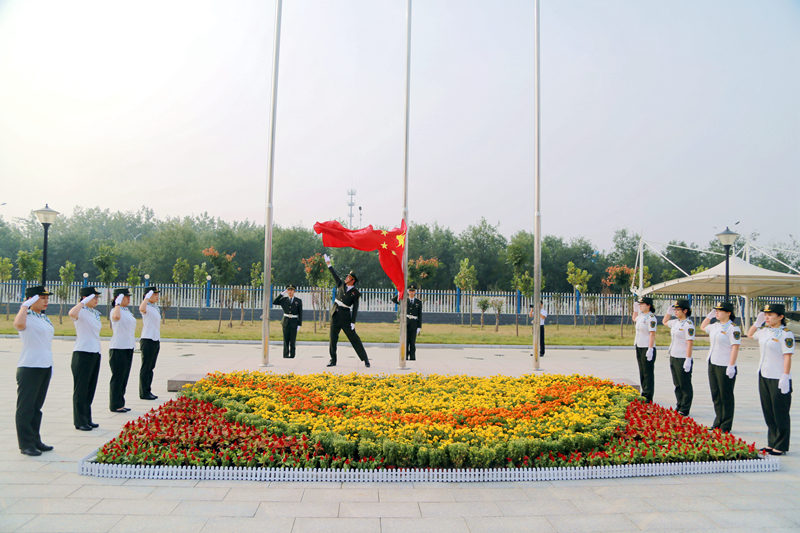 上午9:00,孫總宣布儀式正式開始。三名旗手迎著朝陽,護衛著鮮艷的五星紅旗入場,他們著裝整齊、步伐矯健。隨后,伴隨著《義勇軍進行曲》的響起,全體人員精神飽滿,懷著激動的心情向國旗行注目禮,高唱國歌。鮮艷的五星紅旗在嘹亮的歌聲中冉冉升起,迎風飄揚。