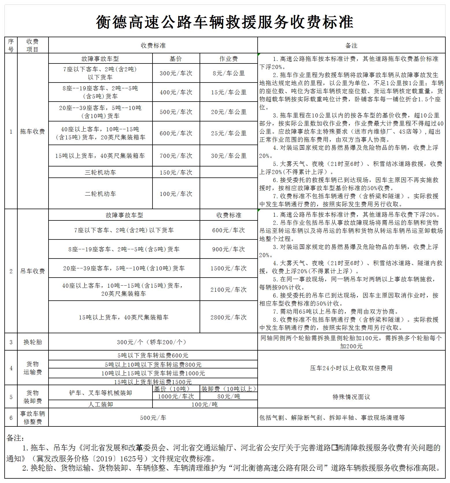 衡德高速公路車輛救援服務收費標準