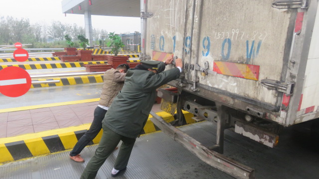 2016年10月23日上午9時許,由橋上緩緩駛來兩輛貨車,進入車道后,疏導孫瀏建發現第二輛車已無法正常行駛,是由第一輛車用拖車拖來的,經詢問,原是第二輛車,壞在了路上,孫瀏建及時通知班長蘇洪杰。由于下雨天路面濕滑,車輛在過減速帶時,車輪打滑,車輛無法正常通過,班長見狀,連忙與趙艷博和孫瀏建將車輛推出車道,事后司機師傅連忙道謝,收費B班再次為司機師傅解決了問題。