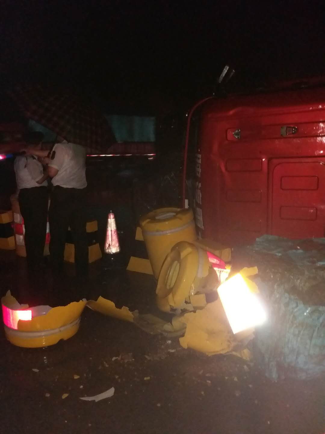 7月13日,大雨隆隆的下著,晚上十一點左右一輛滿載貨物的貨車在通過衡德高速景州主線收費站時,因路面濕滑剎車失靈,自ETC車道闖桿,司機在躲避前方高速警示墩時,發生側翻。