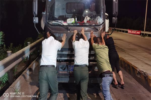 6月18日夜班,廟鎮站收費D1班上崗期間,一輛滿載的藍牌貨車在收費車道內無法啟動,班長與疏導員立即上前查看情況,此時正值車流量高峰時段,為保證收費站正常通行和車輛安全,大家迅速疏導車輛,并組織人員將車輛推到安全地帶。