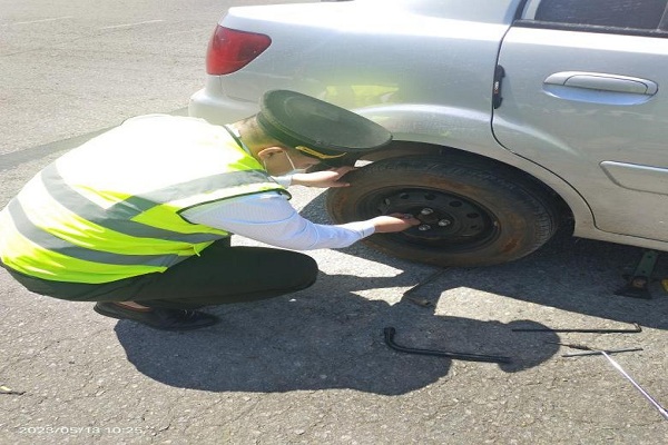 5月13日上午,衡水東收費站收費班長侯良瑋在疏導車輛時發現一輛轎車行駛軌跡搖搖晃晃,十分危險,見此情況他急忙上前查看情況,經詢問后得知,司機火急火燎地帶家屬去醫院做檢查,途中車胎被扎影響行駛,慌亂中急忙來收費站尋求幫助。