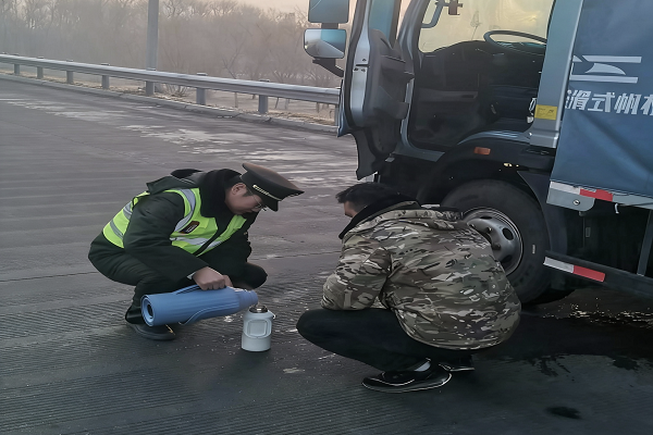 見此情形,班長立即通過對講機呼叫疏導人員,讓他們用反光錐桶在車輛后方設置安全區域,既保證了拋錨車輛的安全,也確保后方車輛能夠順利通行。同時,他轉身從便民服務臺取來暖水壺對司機說:“師傅別著急,這大冷天的,先喝點熱水暖和一下。需要幫您聯系附近的修理廠嗎?”