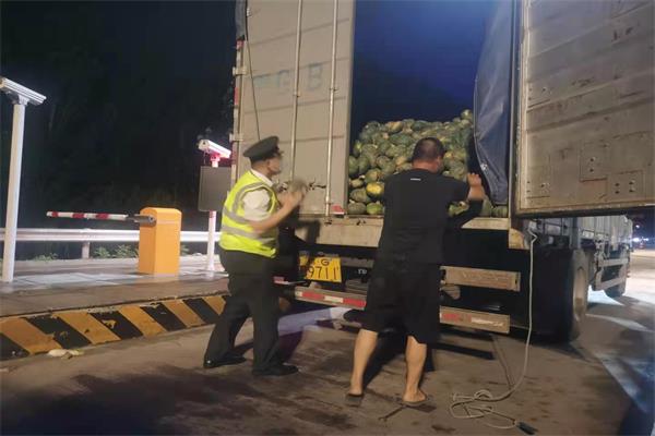 2021年7月14日夜班,一輛車牌號為黑 GB9771的綠通車輛駛入廟鎮收費站南站,司機要求免費,在查驗綠通時,司機剛打開車后門,掉落十幾個南瓜。收費D2班驗貨人員按規定迅速驗貨拍照錄像后,幫助司機把散落在地上的南瓜裝到車上。司機笑著說了聲謝謝,班長說沒事這是我們應該做的。