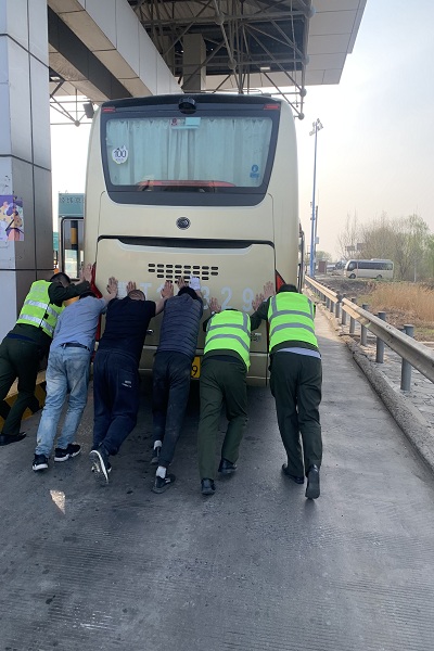 大巴車拋錨收費(fèi)站?工作人員秒變“推車俠”
