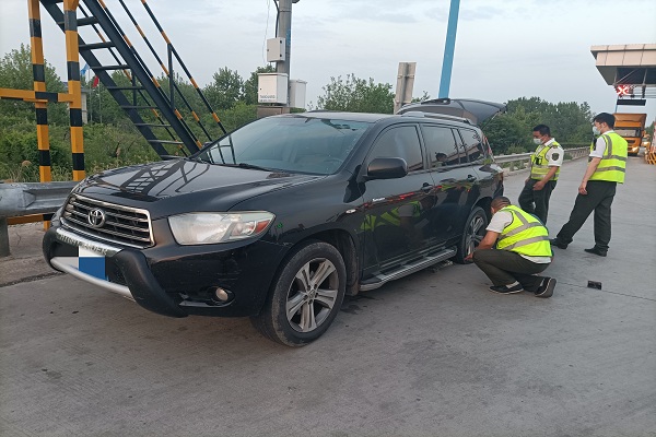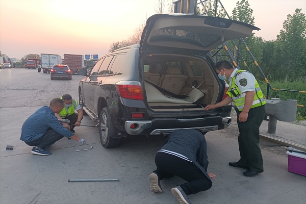 當晚,一輛黑色汽車行駛至衡水東收費站出口繳費,值班站長在外疏導時注意到,這輛汽車左后輪胎充氣不足,隨即通知當班班長和收費員前去查看和提醒,司機下車查看后方才得知輪胎漏氣,由于車主沒有換胎的經(jīng)驗,一時間不知所措。