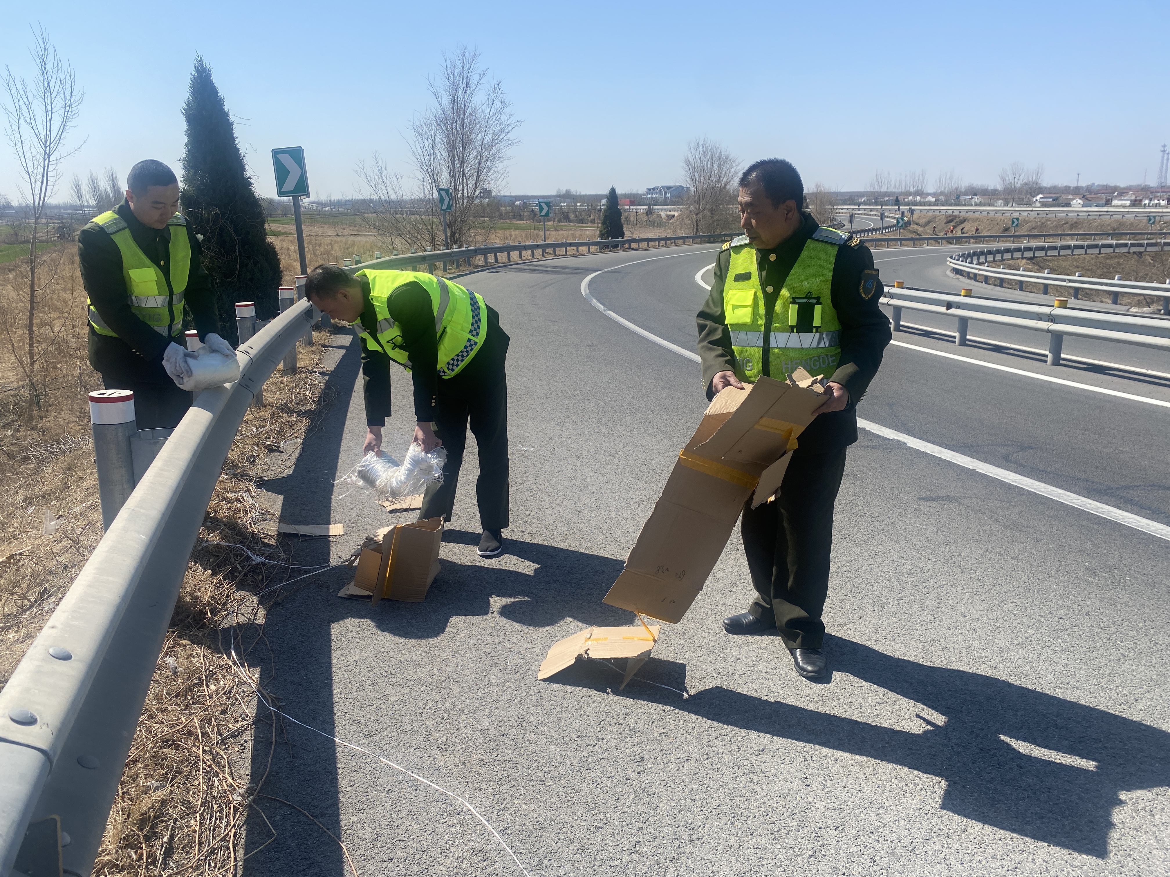 ? ? ? ? 3月18日午時,司機在鄭口收費站下高速繳費時,告知有貨物掉落在出口匝道處,影響正常的行車秩序,容易引發二次事故。班長柳嘉誠立刻將情況報告給值班站長,值班站長曹夢海隨即組織人員前往貨物掉落地點,設好警戒,拉響警報,提示過往車輛注意安全,趁車流間隙迅速把散落貨物清理出車道,公路恢復正常通行。