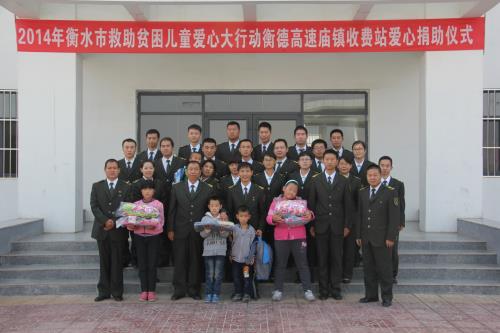 1025日,在衡德高速?gòu)R鎮(zhèn)收費(fèi)站隆重舉行2014衡水市救助貧困兒童愛(ài)心大行動(dòng),開(kāi)展愛(ài)心捐助儀式。衡德高速公路分公司黨總支書(shū)記郭志戰(zhàn)和高速巡警景州大隊(duì)李峻衡教導(dǎo)員以及廟鎮(zhèn)站的全體職工們出席了這次的捐贈(zèng)儀式。