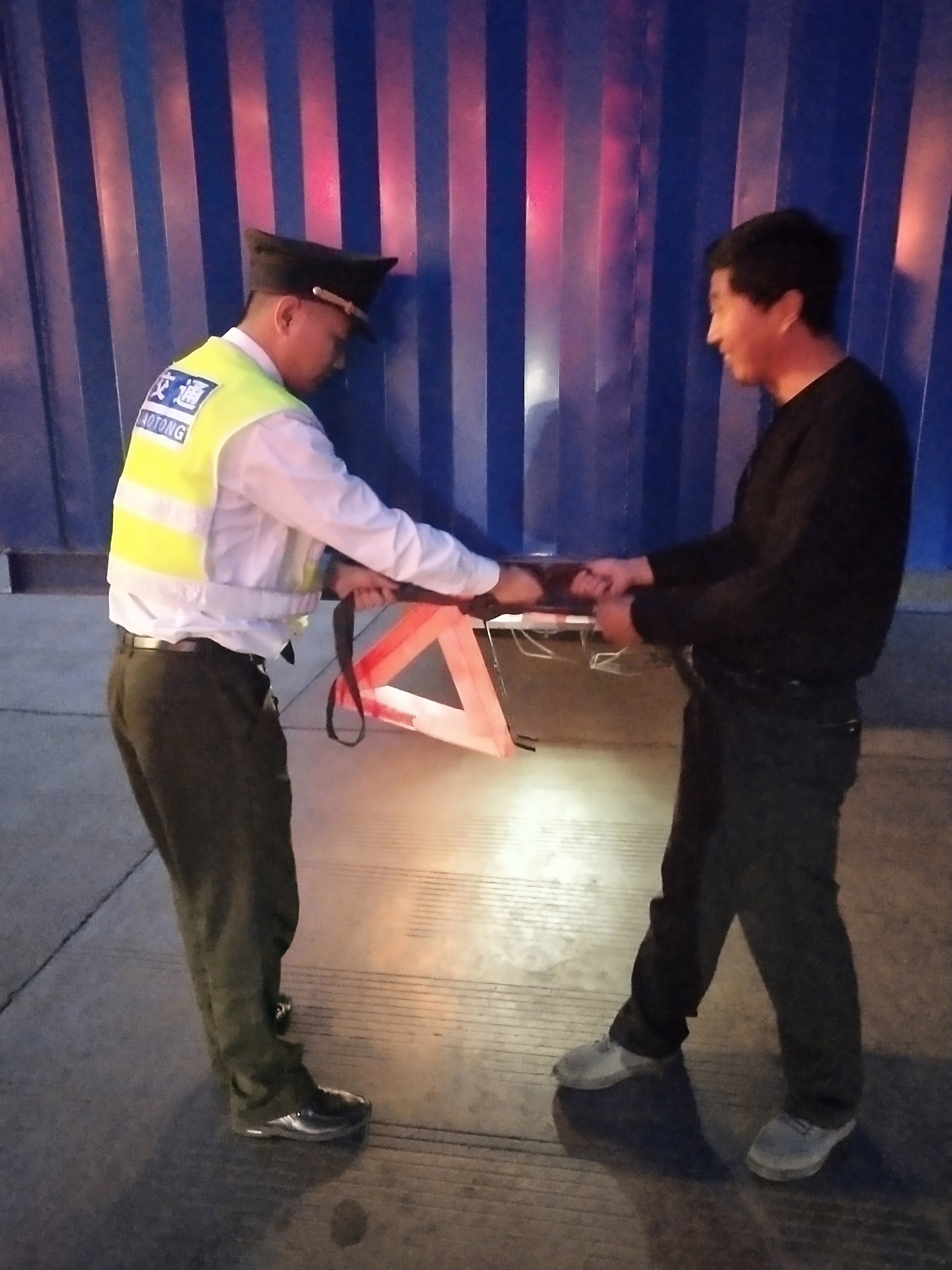 為了避免擁堵,我先讓司機把車開到前面靠邊停在路邊,然后立即用對講通知班長人員,讓他們幫助司乘在車后面懸掛三角架,確定無誤后,再讓車上道發(fā)卡通過。