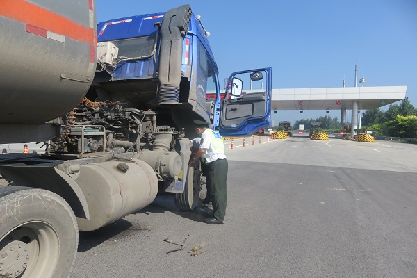 2019年7月21日,青蘭收費站在接到開道通知后迅速反應,安排疏導車輛有序駛入高速。突然,一輛六軸貨車在車道前方熄火,司機連續嘗試幾次都沒有啟動車輛。正在疏導車輛的收費班長平國慶和疏導員多林迅速在車輛周圍擺放反光錐筒,確保車輛安全,并組織安排車輛通行其他車輛。