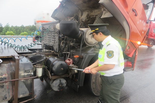 正在執(zhí)勤的疏導(dǎo)員周偉立即上報(bào)班長,兩人迅速上前查看。車輛因油路問題無法啟動(dòng),司機(jī)正在尋找故障點(diǎn)。青蘭收費(fèi)站德遠(yuǎn)班班長平國慶與疏導(dǎo)員周偉迅速在車輛后方擺放警示裝置,然后協(xié)助司機(jī)處理故障。