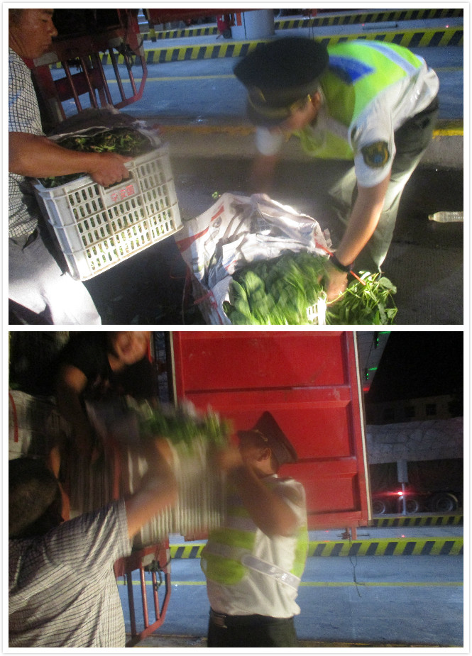 9月3號晚上十一點左右,景州主線收費站收費D班正像平時一樣進行忙碌但有序的工作,這個時間的綠通車輛很多,一輛接一輛。當我對一輛來自東洋河運送蔬菜的貨車進行檢驗時,從車頭走向車尾的過程中發現車道里散落了一地的菠菜,司機說可能是路途太遠在運送過程中箱子晃動導致一開車門菜筐掉下來了,這時我們班組的疏導員陳思尚二話不說就幫司機抬筐撿菜,司機一直道謝,陳思尚說:“這是我們應該做的,不用客氣”。