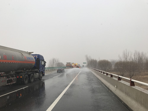 清晨8點左右,天空開始飄落雪花,工區領導班子立即下達工作安排和任務,組織養護人員和機械設備冒著雨雪對衡德高速主線及故城支線沿線橋涵路段和匝道急彎進行了拋灑液態融鹽劑作業,防止過往車輛打滑而造成交通事故,確保所轄路段安全通暢。